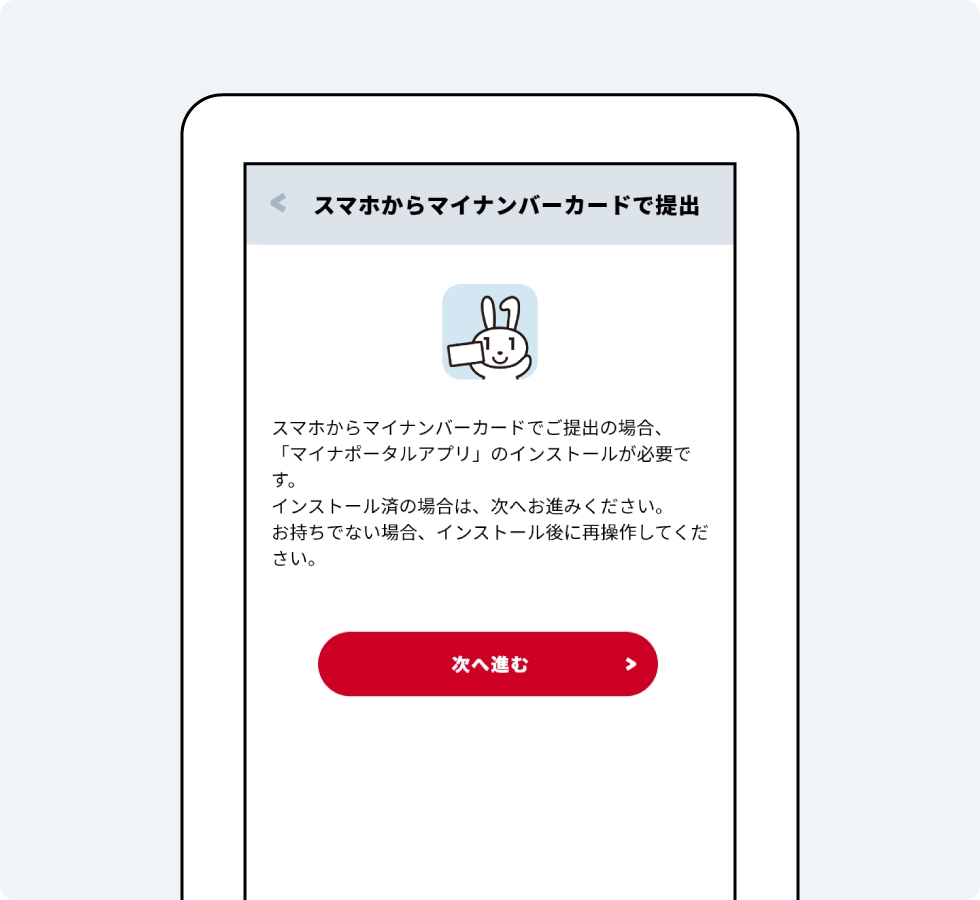 - 3「次へ進む」をタップし、マイナポータルアプリを起動