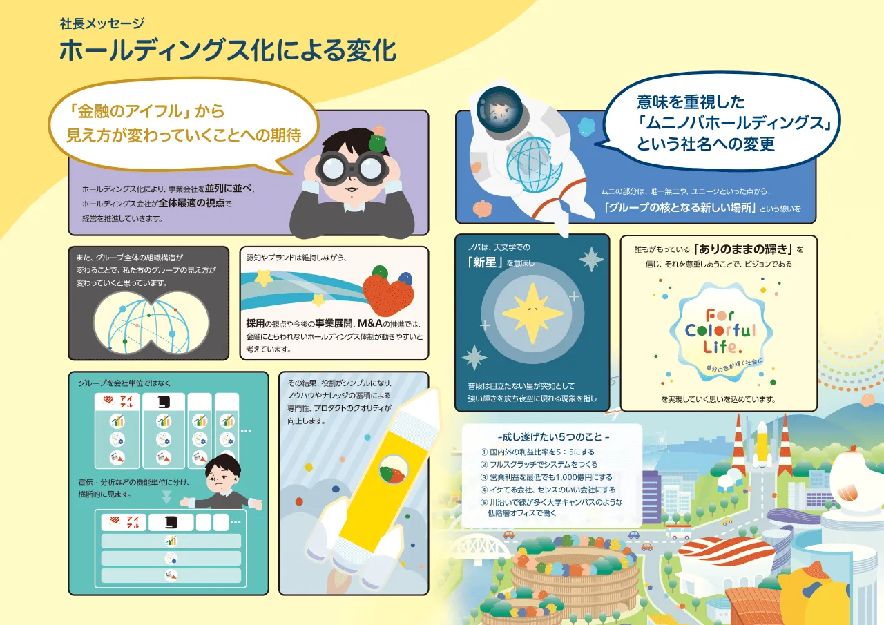 今後のアイフルグループの展望、ホールディングス化による変化を、代表取締役社長の福田からのメッセージとして掲載しました。読者の皆さまに伝わる内容にするだけでなく、親しみやすさをもっていただけるよう、マンガテイストで制作しました。