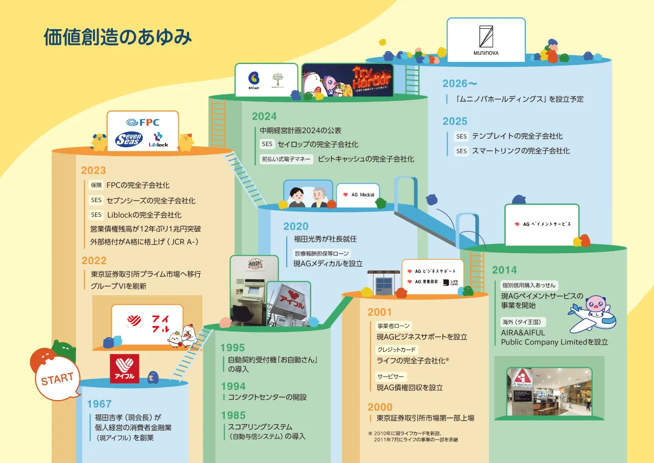 マンガやイラスト、写真を多く取り入れて、新しい挑戦を続けるアイフルグループの「広がり」や「未来への期待感」を、読者にとって親しみやすく分かりやすい表現でお届けしています。