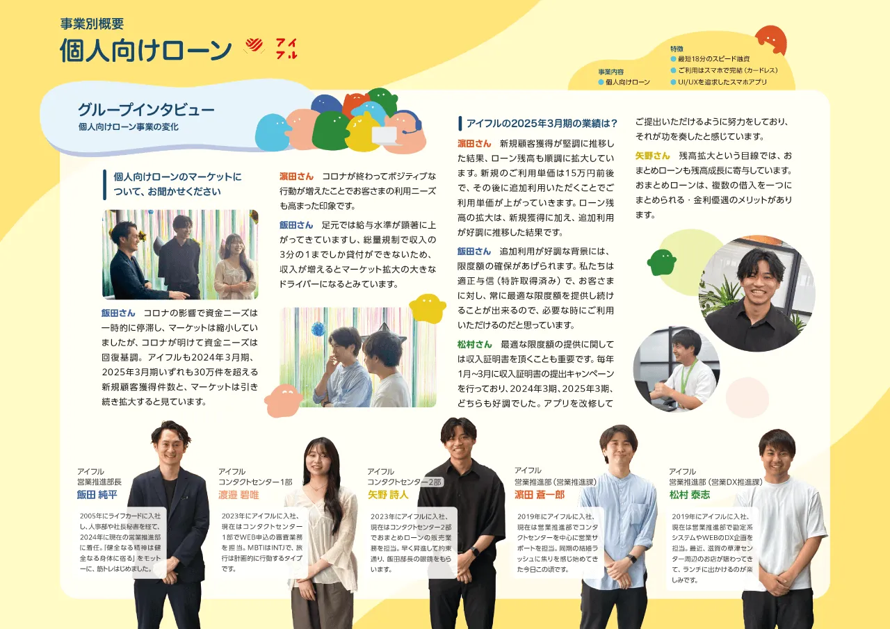 アイフルグループではローン事業に加え、クレジット事業や信用保証事業など、幅広く事業を展開しています。アイフルグループの強みを活かした各事業の動向や最新の取組みを、まさにその事業に従事する社員が紹介しています。