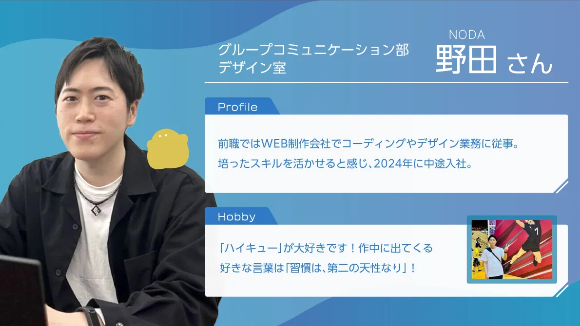 前職では残業が多くハードな働き方でしたが、現在のデザイン室は月9時間程度の残業で、超過時はすぐ帰宅できるホワイトな環境です。ただ、その中で効率よく作業し、高品質な成果を出すことが求められます。私は多い時で6案件を同時に対応しています。業務量が増える中、限られた人材で成果を出すことが重要です。私もスキル向上に努め、会社とともに成長していきたいと考えています。