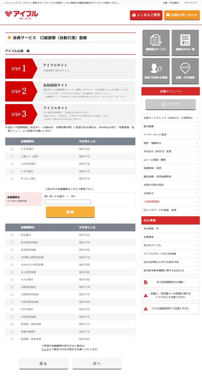 アイフルのWebサイトの改善やシステム開発を行っています!具体的には、口座振替の金融機関を選ぶ際の検索条件について「目的の項目が探しにくい」「スクロールが多い」といった声があり検索条件をより直感的に使いやすく見直し、検索性を向上させました。表現の正確さと使いやすさのバランスにも配慮しています!