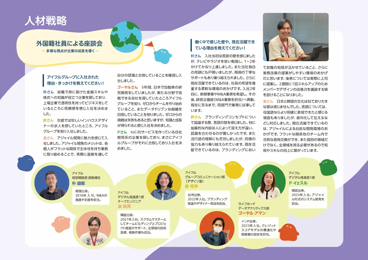 外国籍の社員がアイフルグループで働いて、職場環境の雰囲気や疑問など、赤裸々な意見を掲載しています。京都や東京で勤務している方々を繋ぎ、私自身がインタビュアーとして座談会を開催しました。IR資料としては、こういった外国籍社員が登場するようなものは初めての試みであり、外部から見た会社の印象や、入社前後のギャップを伝えることができたのではないかと思います。
