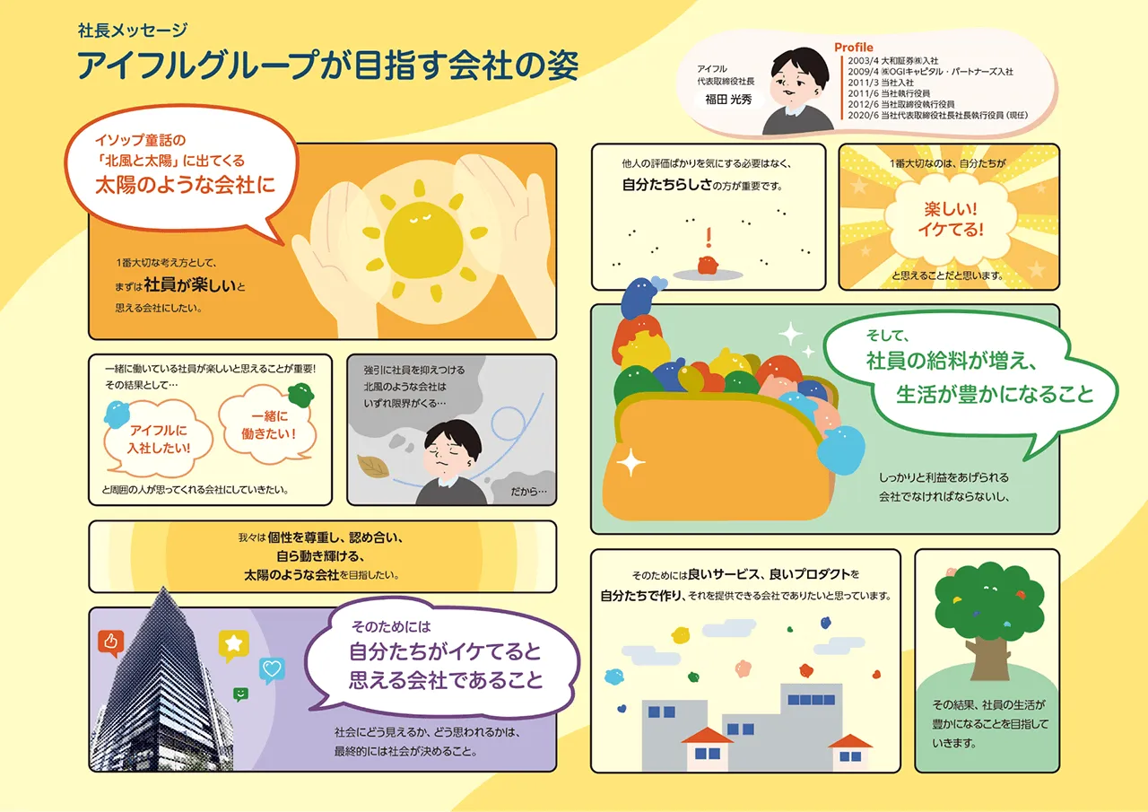 ここは読者にとって、最初に目を通す、かつ一番気になるところでもあり、すごく大切なページです。どのような会社にしたいのか、そのために取り組んでいきたいことといった社長の考えが示されています。デザインチームを持っているアイフルグループの強みも活かせるし、何よりこのページだけは最初からマンガにするって決めてたので(笑)