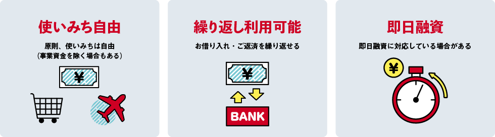 また、使いみちが自由な借入れにはフリーローンもありますが、フリーローンの場合は融資のタイミングは一度きりで、融資を受けたあとは返済をするのみです。