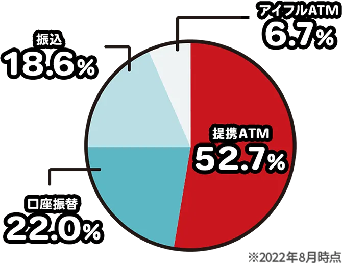 アイフルでは、上記の返済方法①~④すべてに対応していますが、提携ATMを最も多くご利用いただいています。手数料不要で、返済忘れも発生しづらい口座振替も便利です。