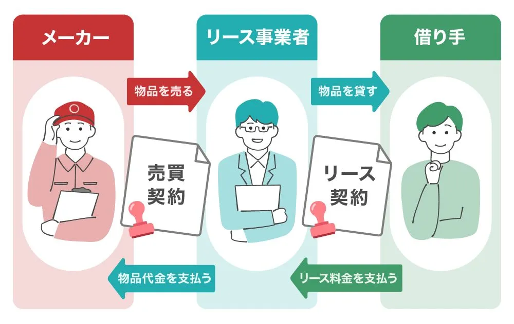 リースは、利用者がほしいと思ったものをリース会社が代わりにメーカーから購入し、利用者に貸し出すサービスです。利用者はリース会社に毎月リース料金を支払うことで、対象物を使えます。