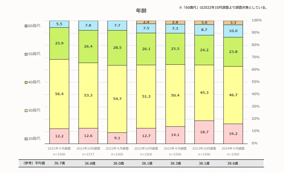 2024年4月調査では、住宅ローン利用者の平均年齢は38.6歳です。最も利用開始が多い年代は30代(46.7%)で、次いで40代(23.8%)、20代(16.2%)が続きます。