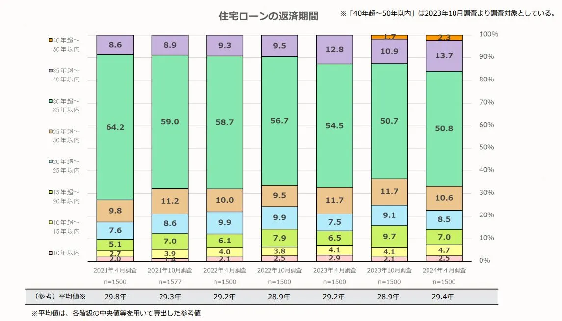 住宅ローンの返済期間は、30年超~35年以内が最も多くなっています。