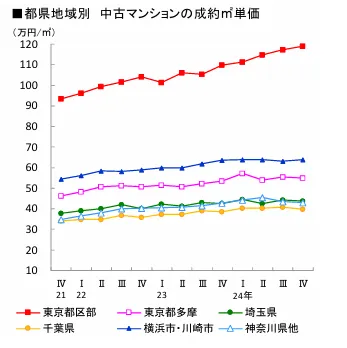 実際、東京の中古マンションの成約m²単価を見ると、神奈川、埼玉、千葉など都市部の中でも最も高く、またその上昇傾向も大きいことが分かります。